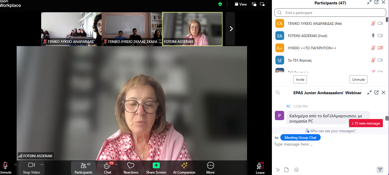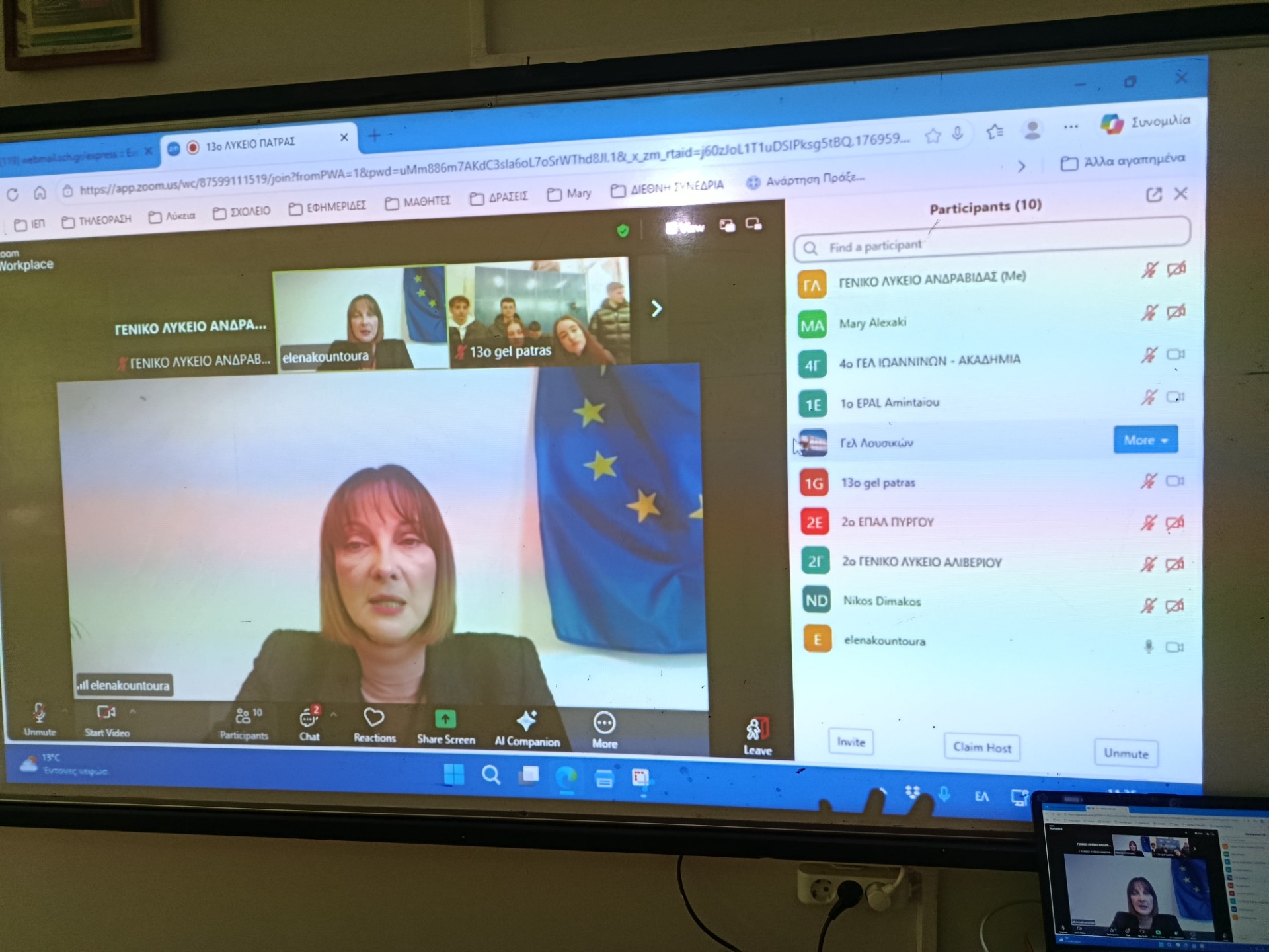 Την Τετάρτη 28-01-2026, στις 11:30, οι junior-volunteer ambassador του σχολείου μας είχαν την ευκαιρία να συνδεθούν διαδικτυακά με την ευρωβουλευτή κα. Έλενα Κουντουρά, προσκεκλημένη από το 13ο ΓΕ.Λ Πάτρας. Μαζί με πολλά σχολεία του Δικτύου EPAS, παρακολούθησαν, αρχικά, την ενημέρωση που έκανε η κα. Κουντουρά για την Ε.Ε (πως δημιουργήθηκε, με ποιο στόχο, ποια είναι τα θεσμικά της όργανα). Στη συνέχεια, κα Κουντουρά μίλησε στους μαθητές για τα ανθρώπινα δικαιώματα, αναφερόμενη περισσότερο στα δικαιώματα των γυναικών. Ενθάρρυνε τα κορίτσια να μη μένουν σιωπηλές αν κάτι τους συμβαίνει ή τους ενοχλεί και τα αγόρια να σέβονται το άλλο φύλο και να το στηρίζουν. Επέμεινε αρκετά στο θέμα των ίσων αμοιβών και των ίσων ευκαιριών στην εργασία, την πολιτική και κοινωνική ζωή.