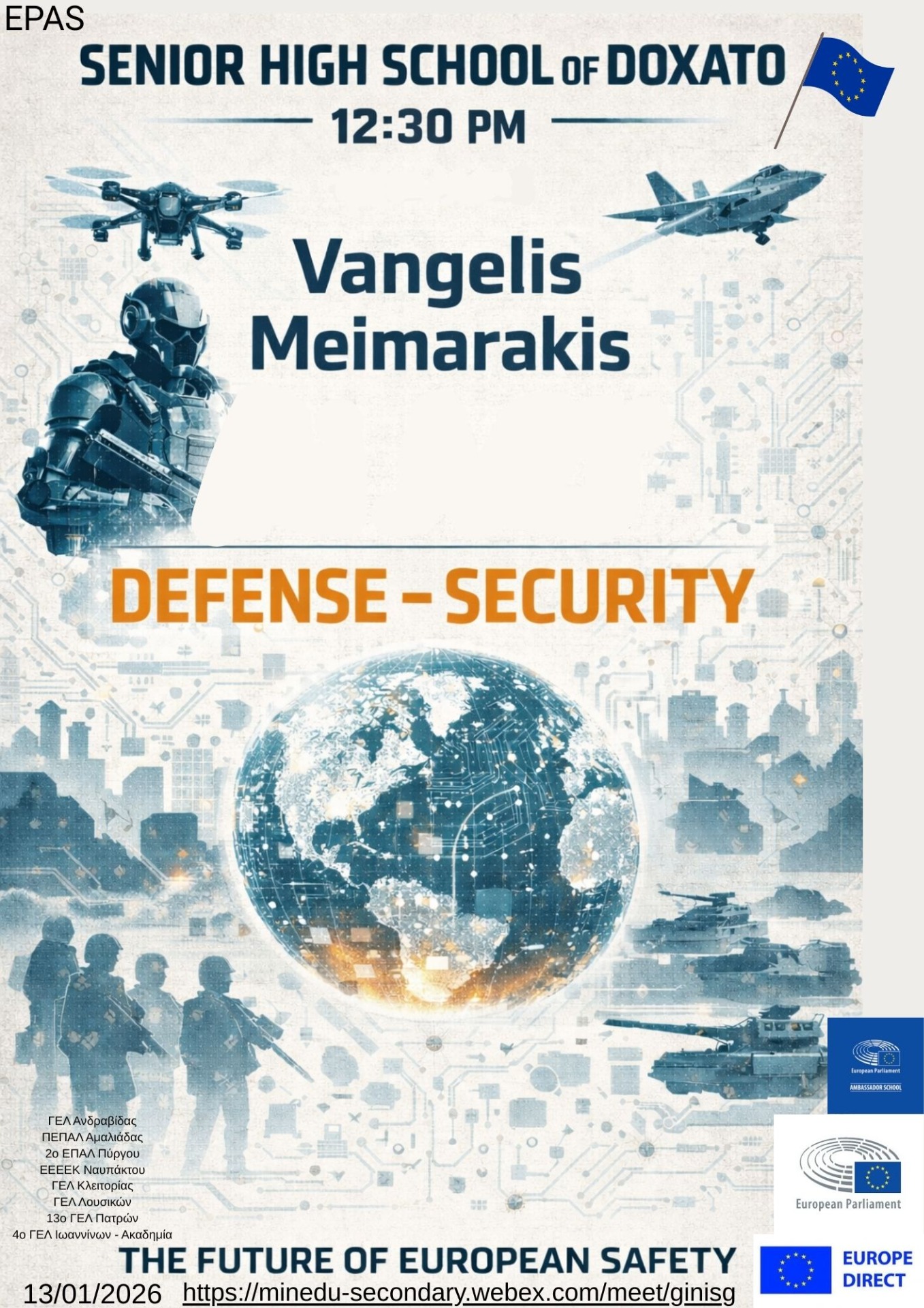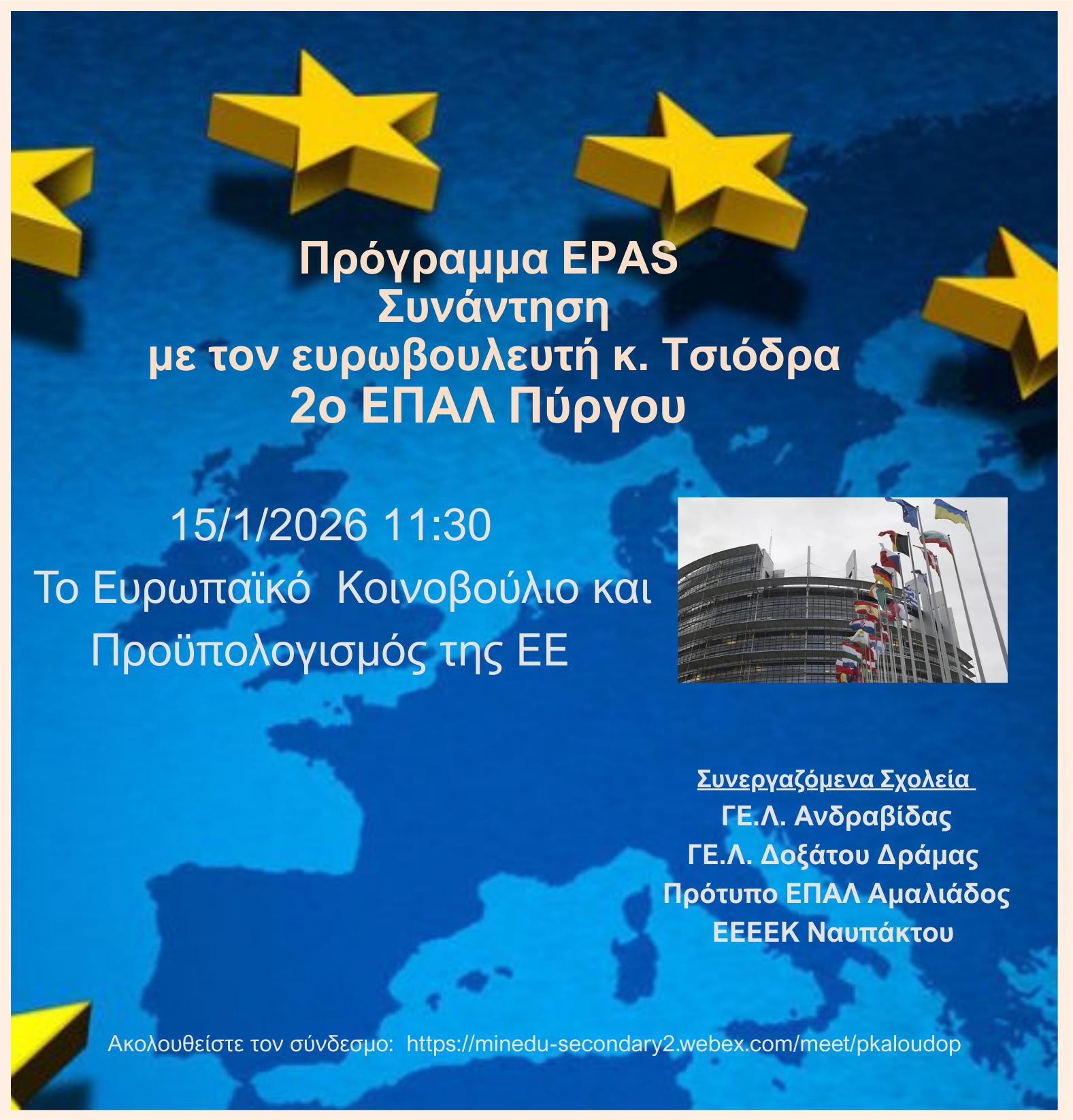 Την Τρίτη 13-010-2026, οι Μαθητές-Πρέσβεις του Γενικού Λυκείου Ανδραβίδας και οι υπεύθυνοι εκπαιδευτικοί τους, συνομίλησαν διαδικτυακά με τον Αντιπρόεδρο της Ομάδας του Ευρωπαϊκού Λαϊκού Κόμματος στο Ευρωπαϊκό Κοινοβούλιο, κ. Ευάγγελο Μεϊμαράκη. Τη δράση διοργάνωσε το Γενικό Λύκειο Δοξάτου Δράμας και την παρακολούθησαν και οι μαθητές EPAS του 2ου ΕΠΑΛ Πύργου. Στο επίκεντρο της συζήτησης βρέθηκε η Ευρωπαϊκή Πολιτική Άμυνας και η Κυβερνοασφάλεια. Μαζί με τους Μαθητές-Πρέσβεις και άλλων σχολείων του Δικτύου EPAS, οι μαθητές του σχολείου μας ρώτησαν, προβληματίστηκαν και πήραν απαντήσεις για το πώς η Ε.Ε. σχεδιάζει να θωρακίσει τα σύνορά μας αλλά και τις ψηφιακές μας υποδομές απέναντι στις προκλήσεις του μέλλοντος.